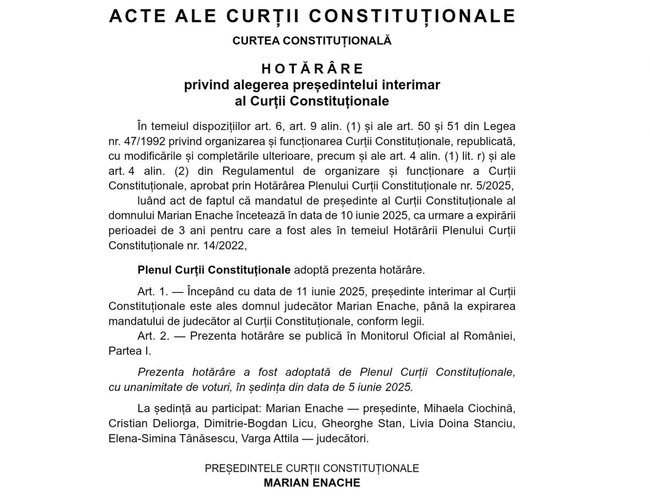 „Începând cu data de 11 iunie 2025, președintele interimar Curții Constituționale este ales domnul judecător Marian Enache, până la expirarea mandatului de judecător al Curții Constituționale, conform legii”, se arată în hotărârea adoptată de CCR în 5 iunie, cu unanimitate de voturi, și publicată în 10 iunie în Monitorul Oficial.