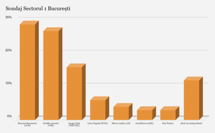Într-un sondaj proaspăt efectuat în Sectorul 1 al Capitalei, Ramona Bruynseels, reprezentanta AUR, se află în frunte cu 29% din intențiile de vot, depășind-o pe actualul primar, Clotilde Armand de la USR, care acumulează 27%. George Țuță, candidatul comun al PSD și PNL, despre care circulă zvonuri că ar fi fost adus de serviciile speciale, se situează pe locul al treilea cu 16% din preferințele electoratului.